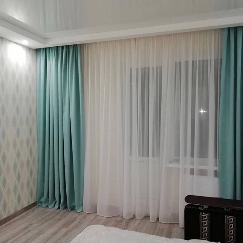 - Если тюль будет со шторой, то по цветовой гамме они должны подходить друг другу.