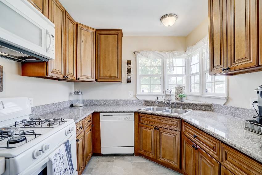 - при недостаточной ширине комнаты, одну из сторон Г-образного гарнитура можно сделать уже на 15–25 см. В этом случае, узкая часть подойдет для хранения компактных бытовых приборов и посуды, а со стороны широкой части удобно разместится крупная кухонная техника;