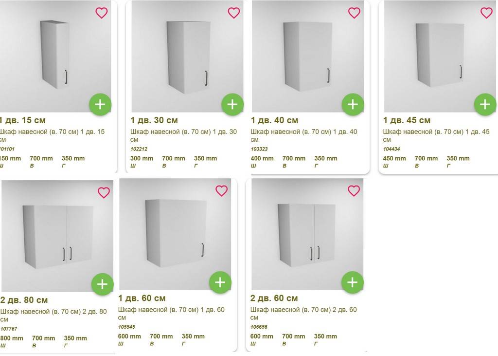 Верхние шкафы имеют несколько вариантов высоты, глубины и ширины. Посмотрим все значения в таблице.