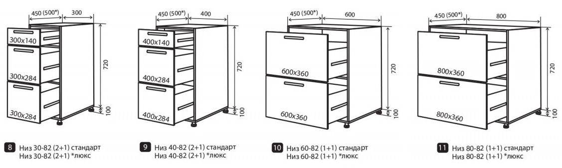 Общие габариты модуля с выдвижными ящиками мы уже описали выше под заголовком «Нижний ярус». Теперь подробнее поговорим о их высоте и количестве, так как данные параметры имеют принципиальное значение в плане удобства.