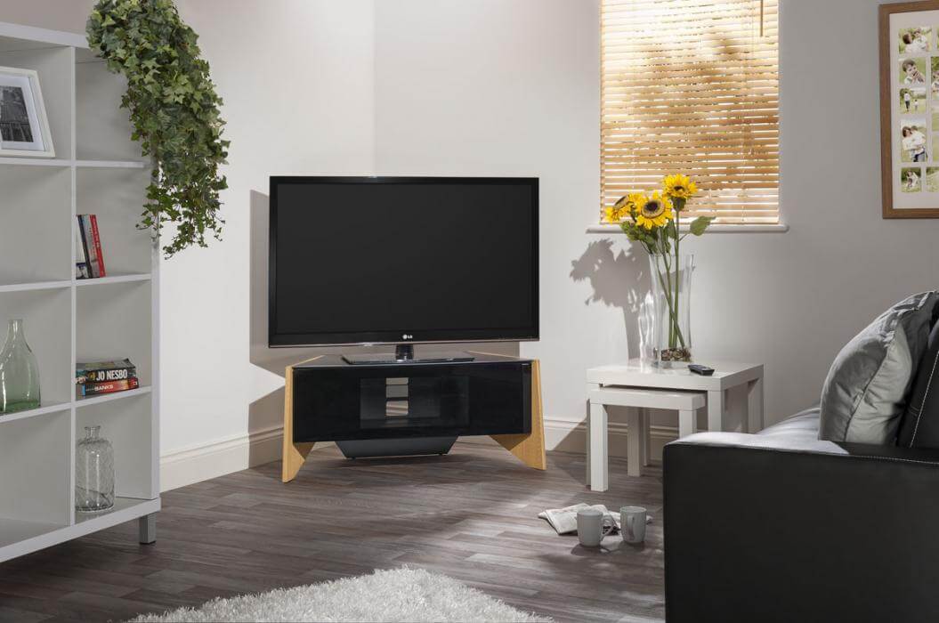 Угловая тумбочка под телевизор идеально подойдет для небольшой гостиной