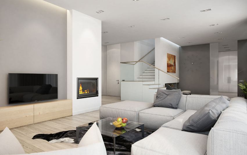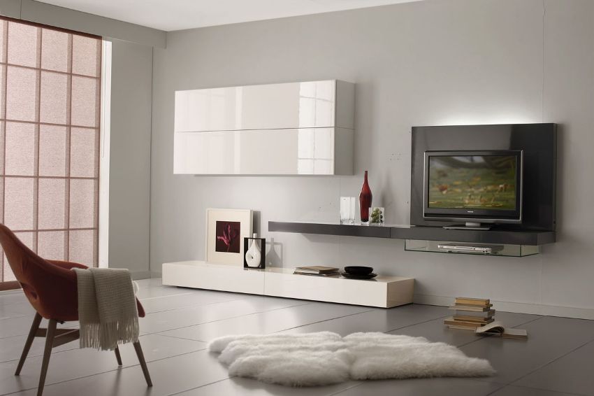 Важно, чтобы опора была надежной. Не стоит покупать модель, которая рассчитана только на вес техники, скорее всего, там будет стоять еще что-то. Обилие глянца в светлой гостиной в стиле хай-тек