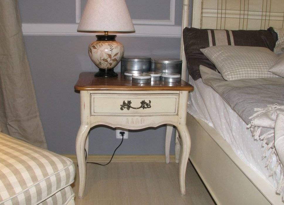 В спальню прованского стиля идеально впишется старинная тумбочка с потертыми поверхностями