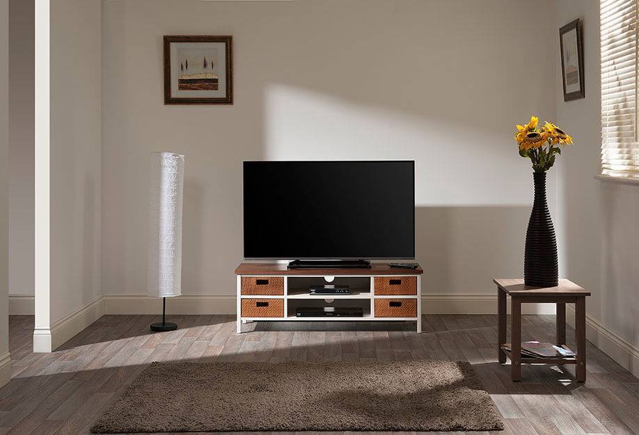 Также существует множество вариантов изготовления длинных тумбочек в современных стилях. В случае, если такой предмет размещен по всей длине стены, то существует два способа крепления телевизора: