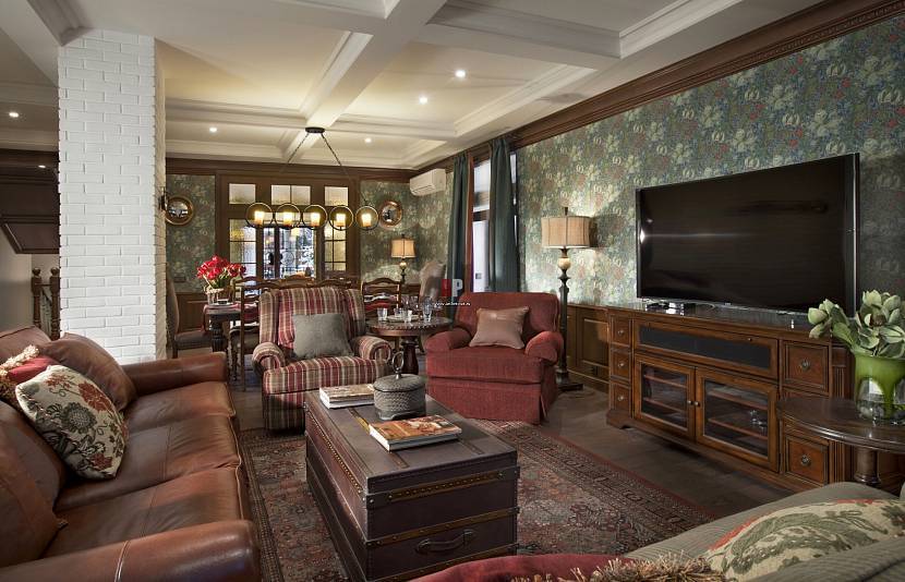 Английский стиль. Его характеризуют спокойные нейтральные оттенки и натуральные материалы. Мебель играет важную роль, ее должно быть много, разнообразной формы и фактуры. Гостиная заметно выделяется, в нее часто включают обеденную зону или столовую.