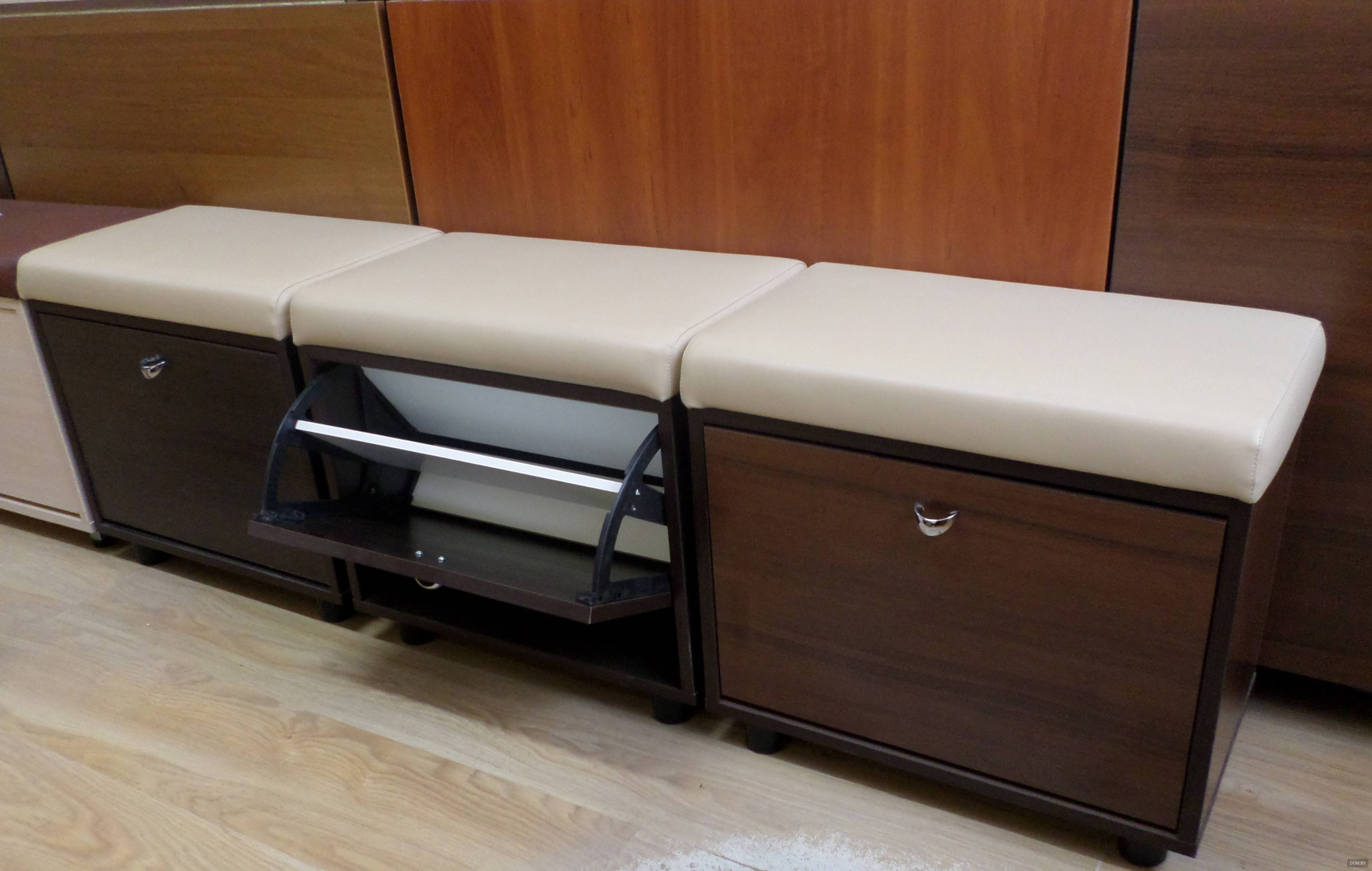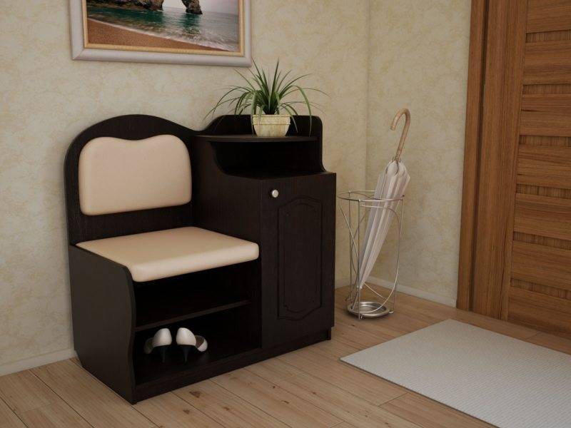 Модели закрытого типа также могут иметь сидения с расположенными под ними полочками и ящиками. Внутрь входит не только минимальный набор вещей, но и гардероб. В тумбочках подобного типа можно спрятать зонтик или убрать в них косметику для ухода за одеждой или обувью.