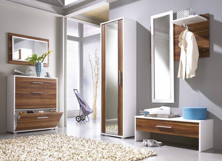 Главная проблема, которая возникает в процессе обустройства малогабаритного холла – захламленность. Избежать ее поможет аскетическая обстановка. Она предполагает использование только крючков на стене, служащих для размещения одежды, полки для обуви закрытого и открытого типа. Шкаф в таком случае находится в другой комнате. Это позволит сохранить пространство свободным для передвижения. В противном случае крохотное помещение будет тесным и неудобным.