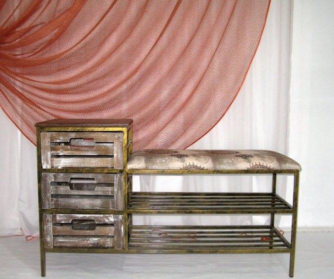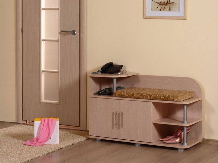 Довольно интересно смотрятся в интерьере тумбочки с сидением. Это и красиво, и вполне функционально: на сидении можно расположиться при снятии или надевании обуви. Подобные тумбы оснащены вместительными полками и ящиками, которые обычно расположены по боковинам. В ящики можно положить нужные вещи.