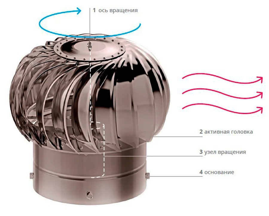 Турбина вращается только в одну сторону, обеспечивая интенсивность обращения воздушного потока и препятствуя образованию обратной тяги. Находящийся в вентканале воздух разрежается и происходит вытягивание газов, пара, влаги, избыточного тепла, пыли из подкровельного пространства, а также из внутренних помещений здания.