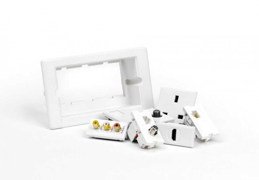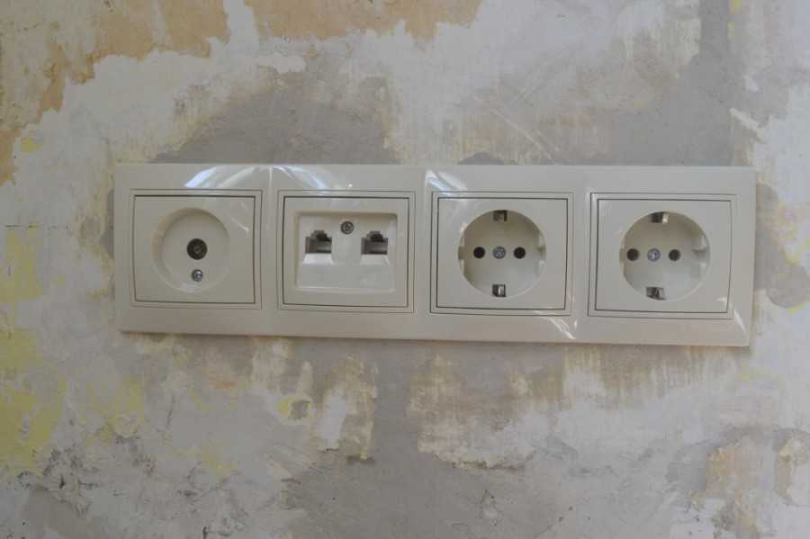 Блок розеток обычно представляет одну длинную панель, разделенную на несколько функциональных секторов: для подключения коаксиального кабеля, интернет провода RJ-45 (витой пары) или электрических кабелей