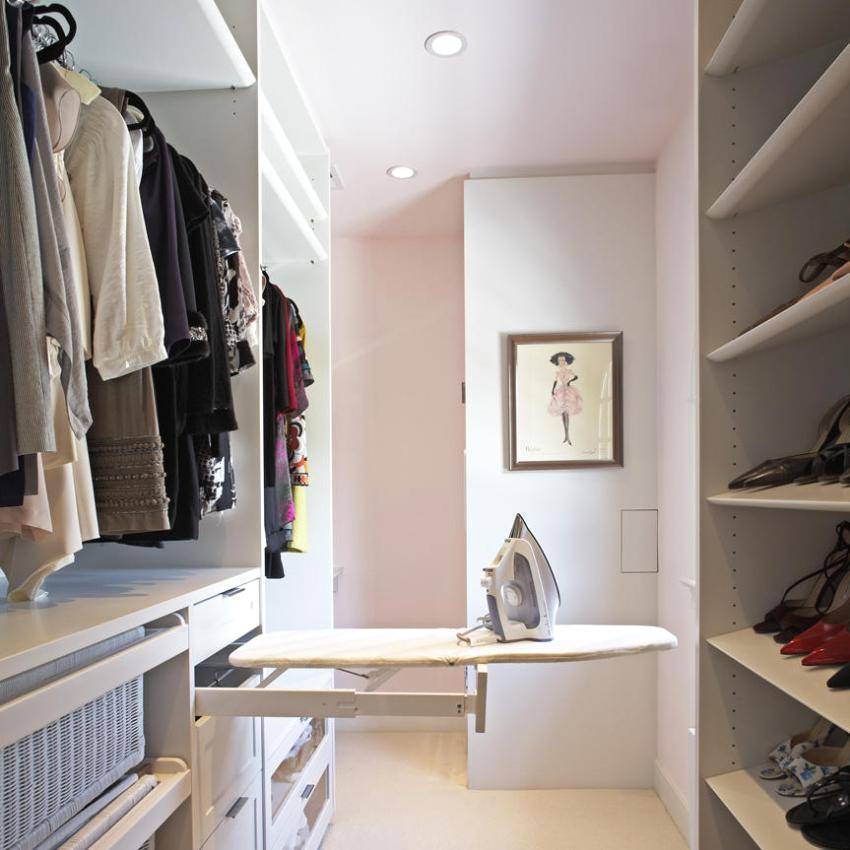 8. Объемными секциями. Это хозяйственное отделение гардеробной – место гладильных досок, пылесосов, швабр, сушилок, ведер и утюгов. Согласитесь, подобную бытовую атрибутику стоит скрывать за дверцами, если есть задача получить не только практичный, но и эстетичный интерьер.