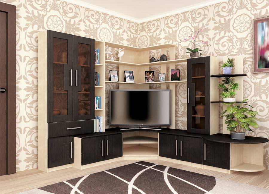 Наиболее популярной корпусной мебелью считается угловая стенка для гостиной, причем в углу обычно устанавливается шкаф. Она может применяться не только как украшение и для содержания разных мелких предметов, но и вовсе может заменять полноценный гардеробный шкаф.