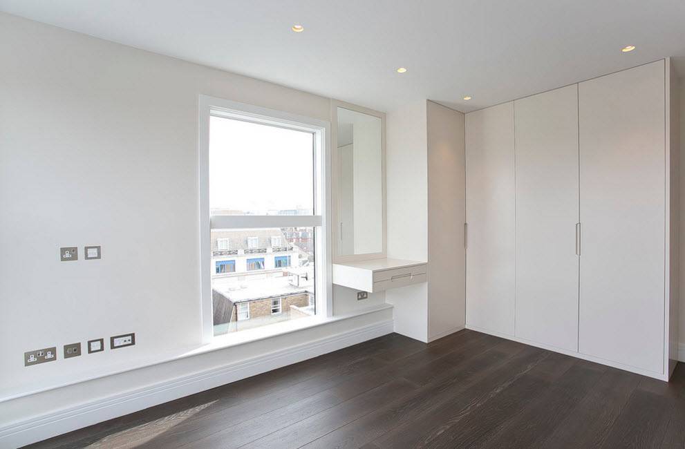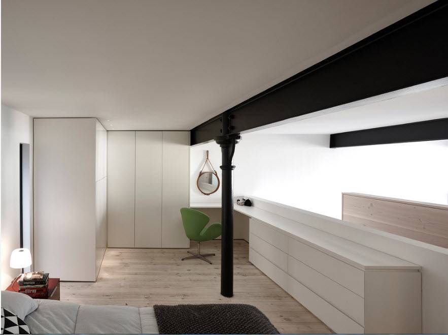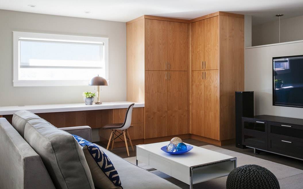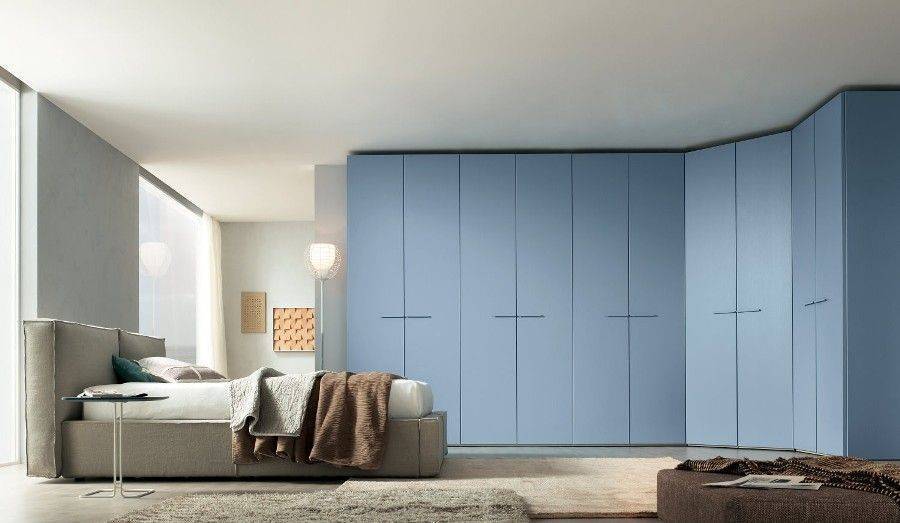 Угловые типы шкафов нередко применяют в дизайне минималистичный помещений. Главным правилом стиля являются лаконичные линии, избавление комнаты от того, что регулярно не эксплуатируется.
