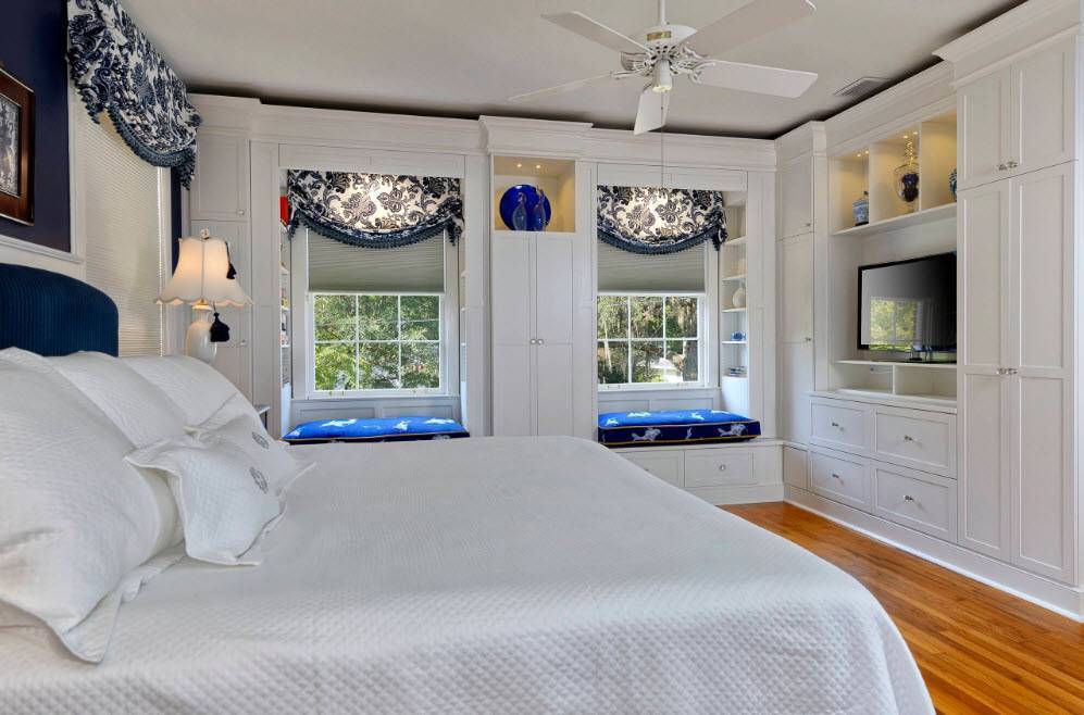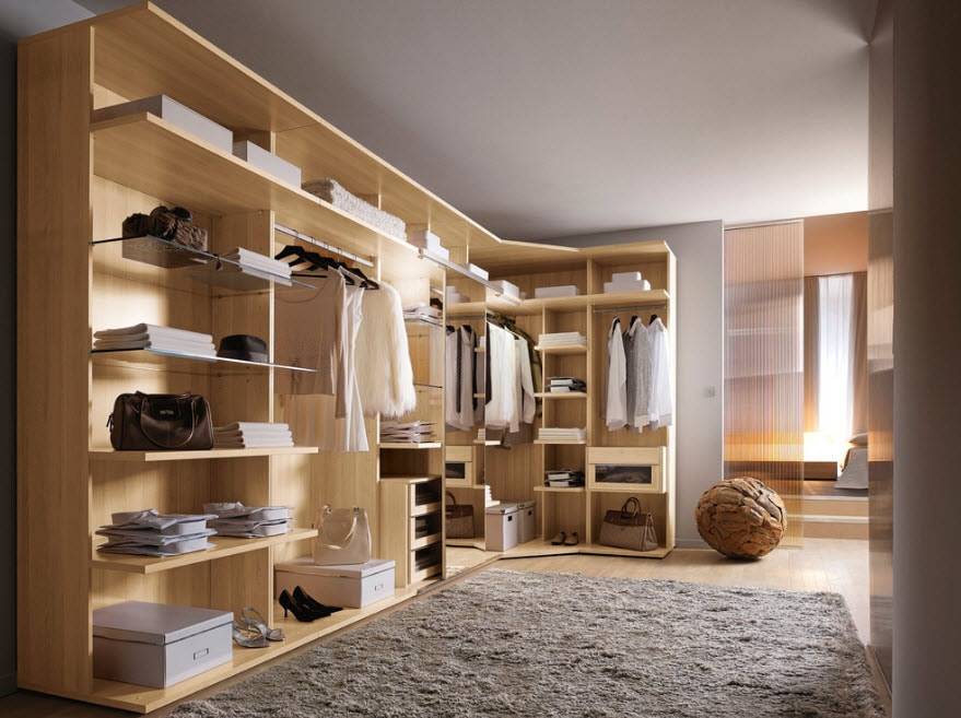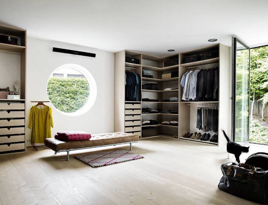 - вместительный шкаф — он обычно является угловым и занимающим много места. Он располагается вдоль смежных стен, причем он может содержать большое количество разных вещей. Обычно он разделяется на две части, одна из которых предназначается для верхней одежды, а другая разделена на несколько отсеков;
