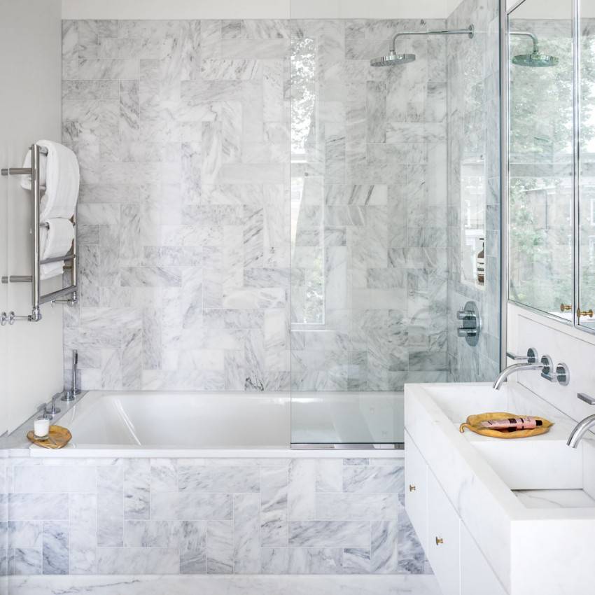 Маленькое пространство не обязательно должно таковым выглядеть. Играйте с границами восприятия, оформив стену над ванной и экран, закрывающий пространство под ванной, единообразно. Это сделает их трудно различаемыми, благодаря чему помещение будет казаться ощутимо больше. Расцветка под мрамор считается наиболее подходящей для этих целей, поскольку отдельные плитки не бросаются в глаза и выглядят как единое целое.