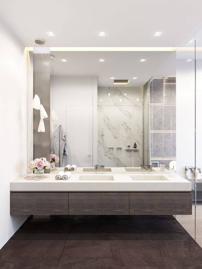 Можно сделать наоборот. Если вы проводите много времени в ванной, то эту часть комнаты лучше сделать светлой, а вторую часть с раковиной и шкафчиком — более темной. В любом случае пол лучше сделать почти белым, это поможет усилить освещение.