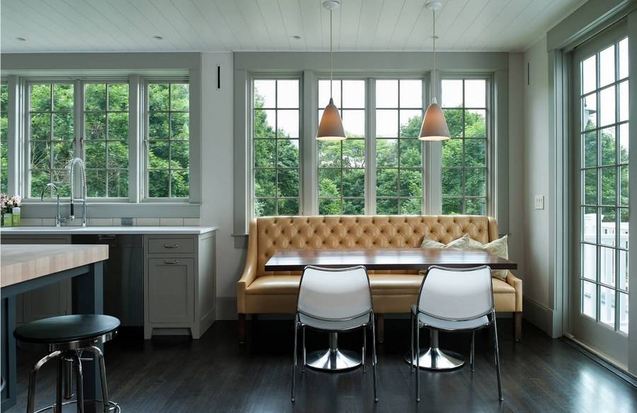 В интерьере кухни с диваном из кожи, этот предмет мебели будет привлекать основное внимание. Из преимуществ следует выделить: прочность, легкость очистки от загрязнений, большой срок службы.