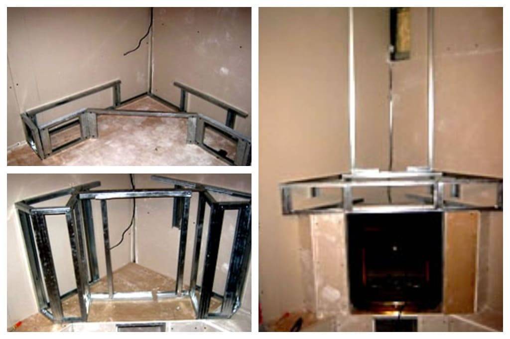 Изготовление этого типа конструкции не имеет отличий от фронтальных разновидностей, изменяется только внешняя форма. Конструирование углового камина своими руками декоративного варианта из гипсокартона проходит так: