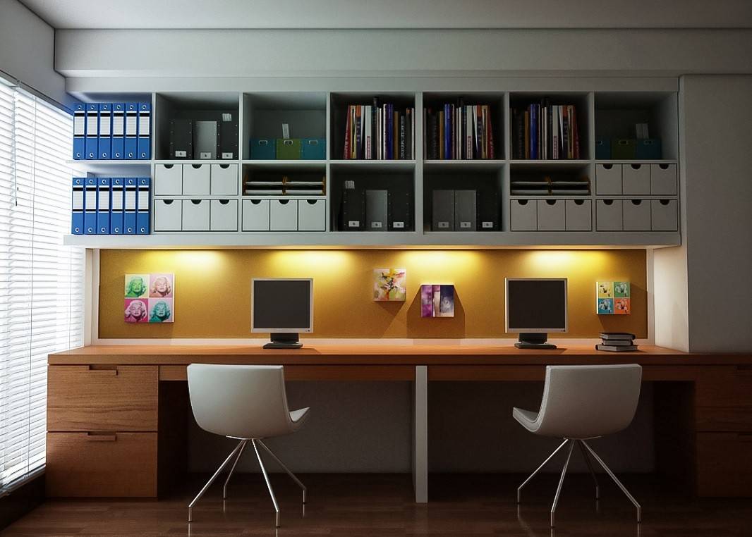 Для больших комнат допустимо размещение письменного стола для двоих школьников вдоль стены. Из преимуществ такого выбора выделяют возможность повесить полки над столом. Из минусов этого варианта очевиден недостаток естественного света в область рабочего места.
