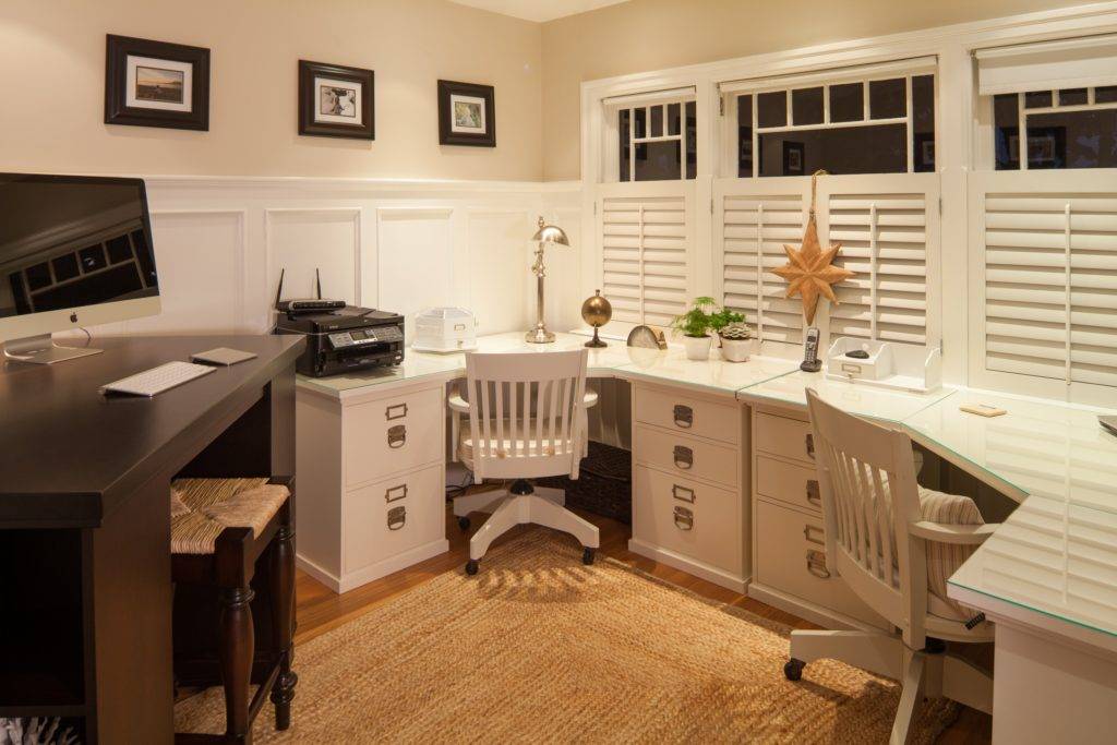 Очень удобны угловые конструкции — дети могут заниматься, не мешая друг другу. Рабочие места могут располагаться двумя способами: