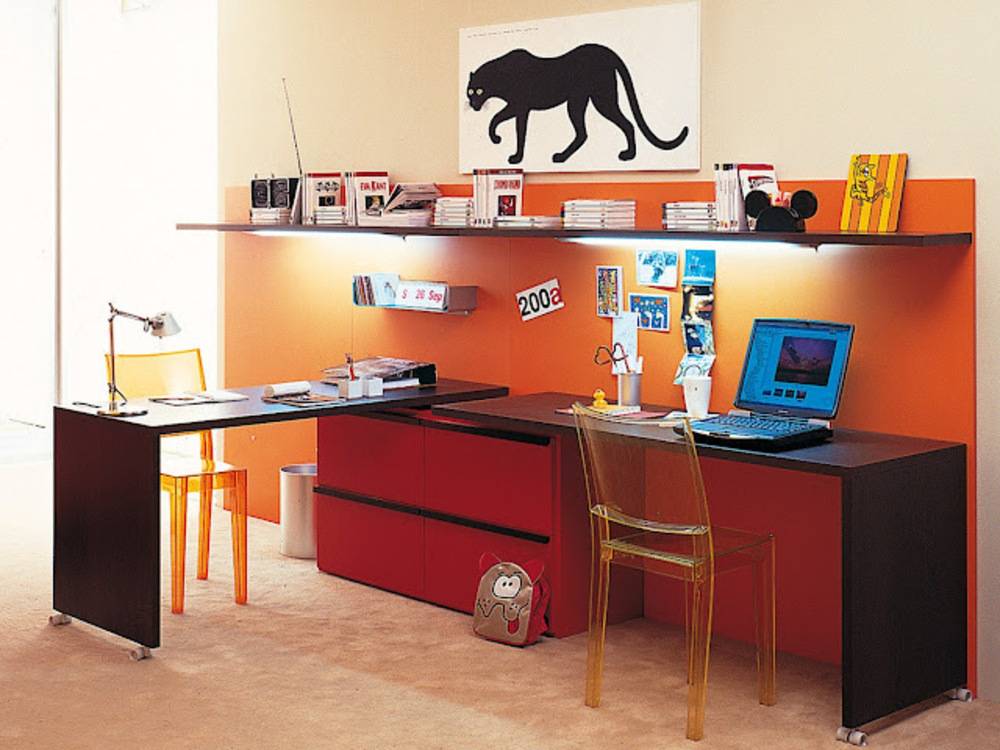 Письменный стол, рассчитанный на двоих детей, вовсе не должен быть стандартным, скучным. Сегодня большой популярностью пользуются оригинальные модели, необычные формы: