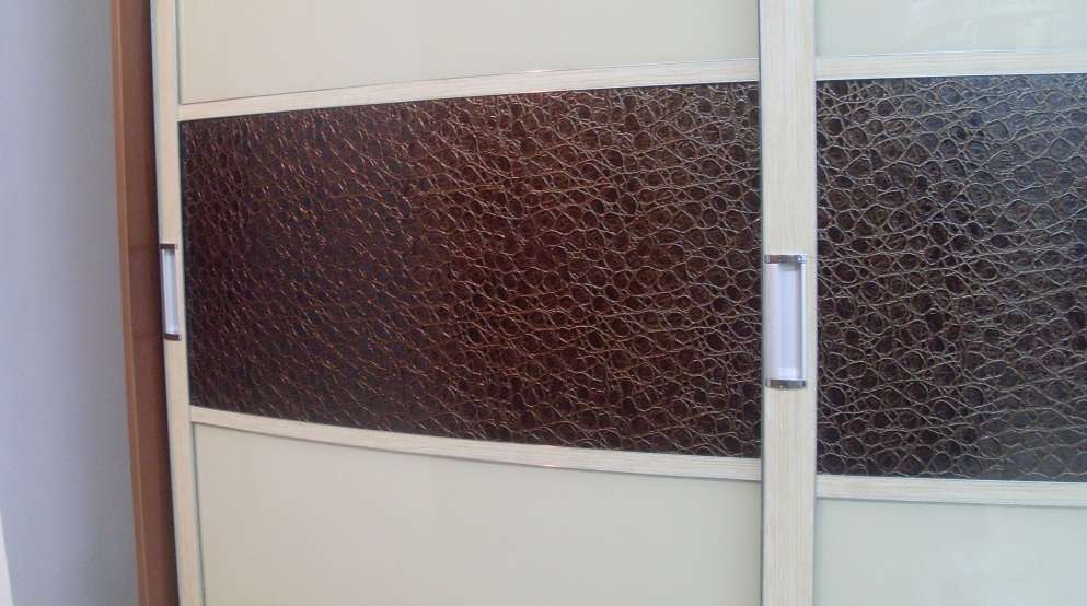 В интерьере любой гостиной роскошно будет смотреться угловой шкаф-купе с фасадом из природных материалов. Так, в отделке часто используют кожу. Она экологична, не склонна к выгоранию и деформации, придаёт солидный и респектабельный вид мебели. Изготовители мебели предлагают широкий ассортимент кожи. Можно выбрать материал яркого насыщенного цвета, плотный по структуре и жёсткий на ощупь либо более мягкую, нежную кожу бархатистого цвета.