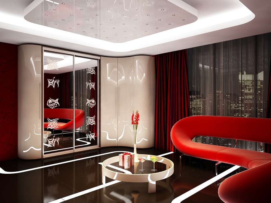 Современные идеи дизайнов углового шкафа-купе в гостиной предполагают использование фотопечати. На поверхность дверей можно нанести любое изображение. Большинство фирм, занимающихся изготовлением шкафов-купе, имеют каталог популярных фотографий и картинок, которыми можно украсить фасад мебели. Можно принести свой вариант изображения. Рисунок наносится на заднюю поверхность стекла, поэтому он не стирается и не выгорает на солнце.