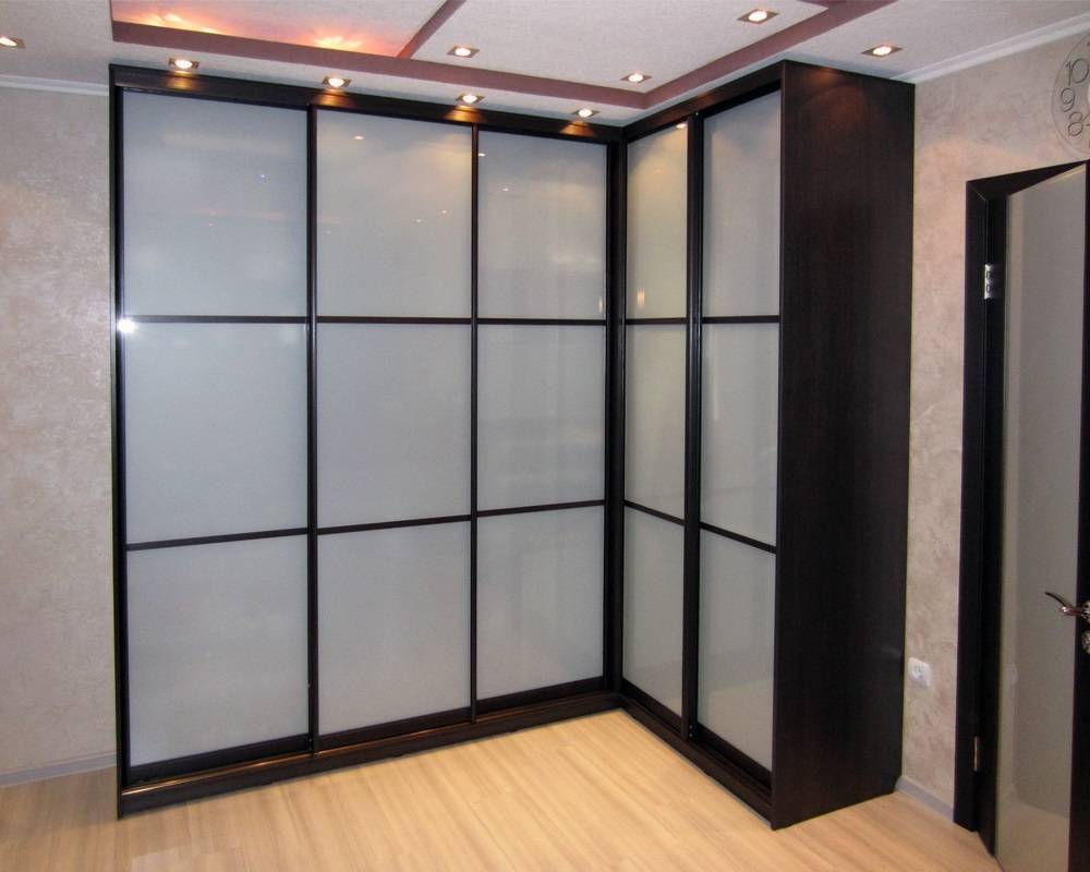 Также, как и угловой шкаф-купе с зеркальными дверями, прозрачные / матовые стеклянные фасады можно покрыть: