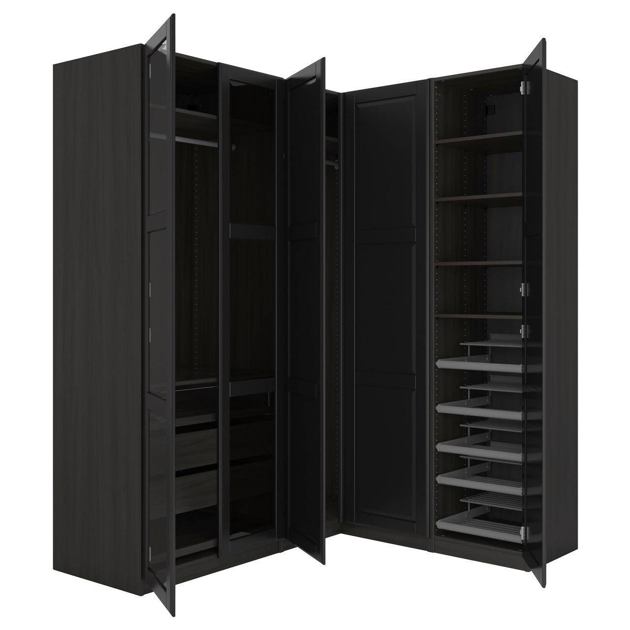 Г- образный угловой шкаф — подходит людям с огромным гардеробом. Его конструкция выглядят в форме буквы Г и состоит из двух, стыкующихся на торцах шкафов. Является хорошим вариантом для хранения многочисленных вещей, а за счет декорации стеклом выглядит не только ни заметным, но и очень практичным.