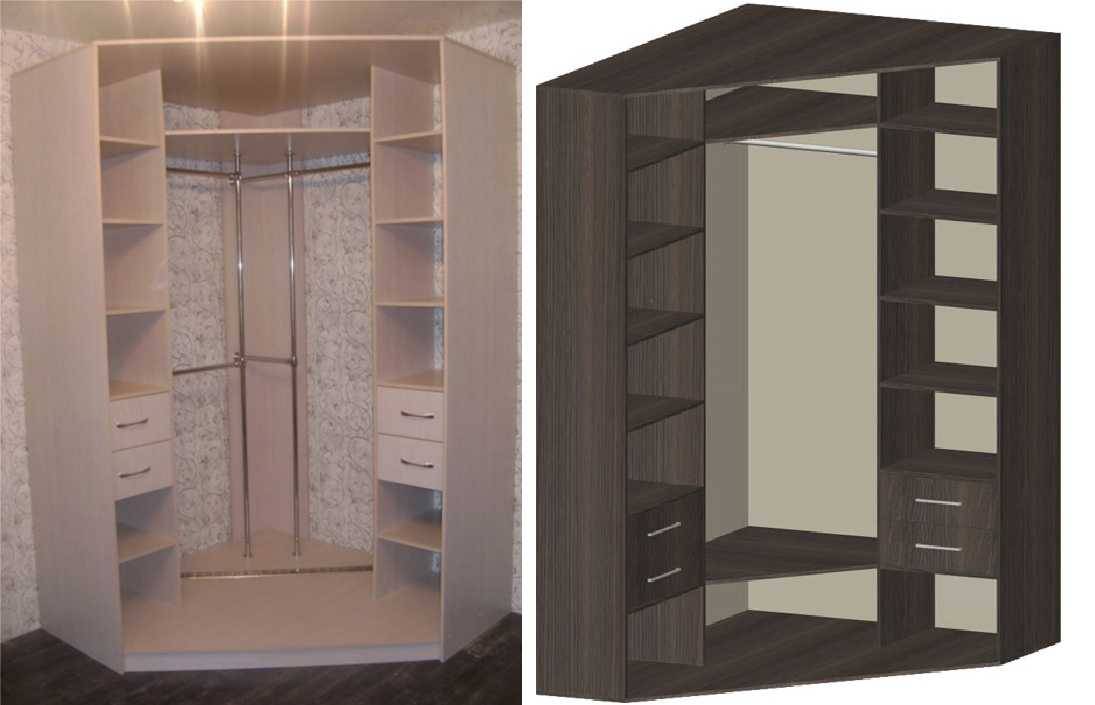 Такая конструкция считается достаточно интересной, но по внешнему виду кажется крупногабаритной. В ней с одной стороны имеется боковая стенка небольшого размера, из-за которой и создается форма трапеции. За счет хорошей вместительности такого шкафа, имеется возможность пользоваться рационально и грамотно внутренним пространством, для чего устанавливаются многочисленные системы хранения. Такие изделия хорошо вписываются в гостиную, а также могут оснащаться открытыми полками, на которых хранятся разные сувениры, декоративная посуда или книги.