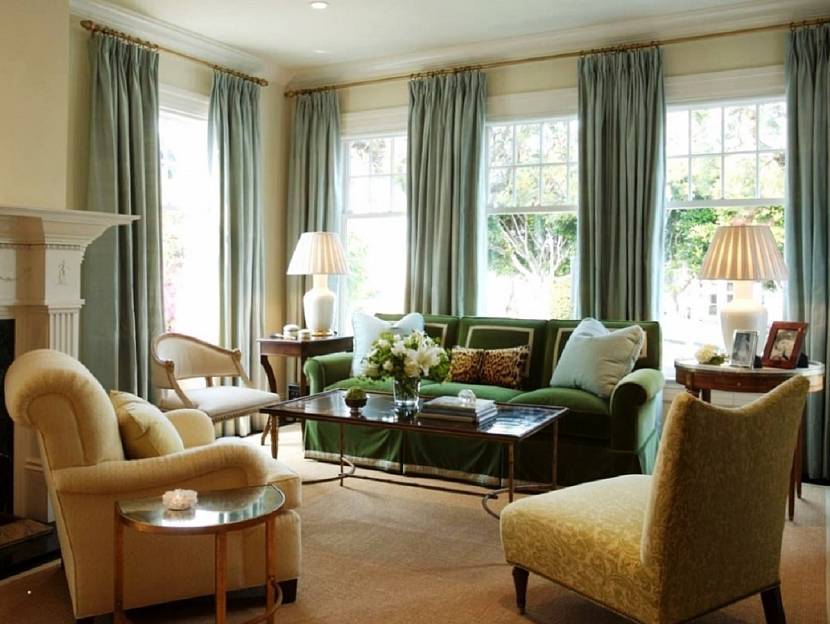 При необходимости выполнить визуальную корректировку, придать комнате солидный, презентабельный вид, занавесями декорируется все пространство стены, на которой находится окно. Такой прием зрительно расширяет помещение, придает интерьеру величие. В оформлении обычно используются трехрядные, двухрядные металлические карнизы для штор, обладающие высокой прочностью, надежностью.