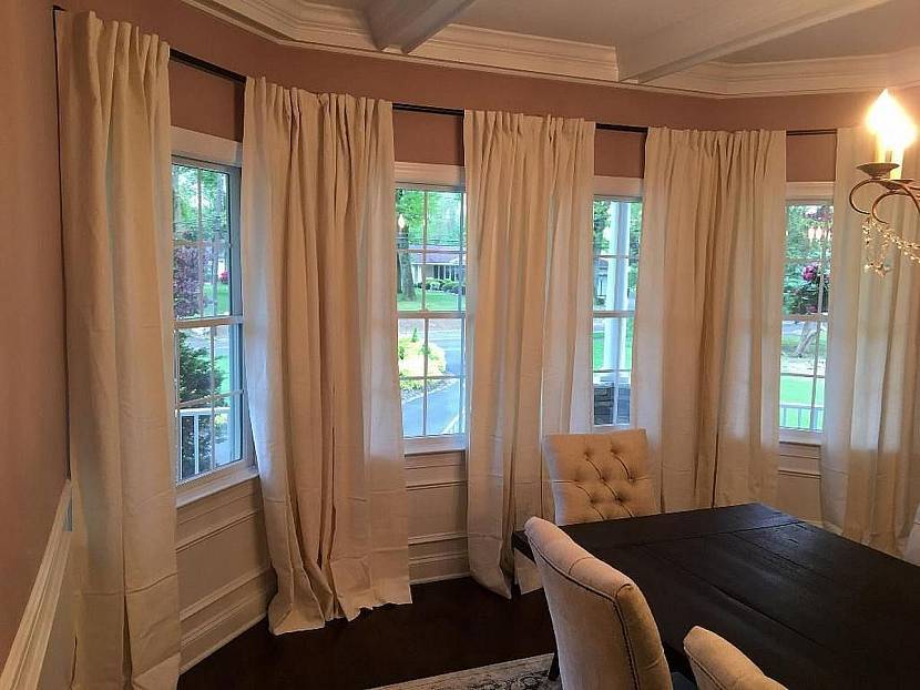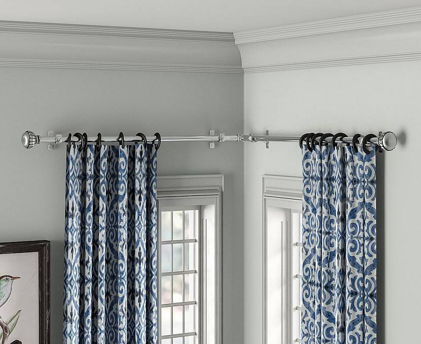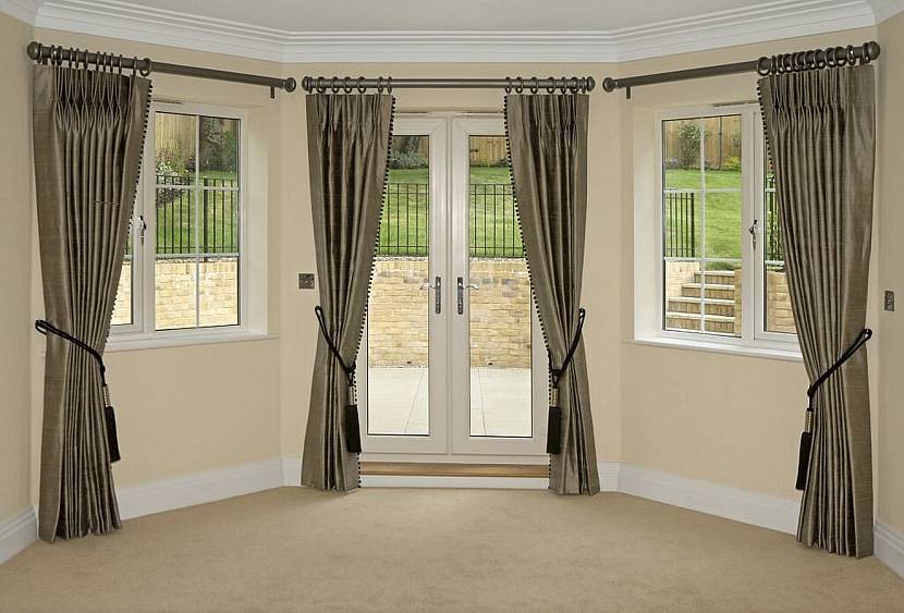 Несмотря на разное расположение окон, дизайн штор должен подчеркивать достоинства и скрывать недостатки проемов. Чтобы не нарушалось визуальное единство композиции, если простенок между окнами очень мал либо отсутствует вовсе, рекомендуется использовать карнизы со специальным стыковочным элементом либо гибкие модели