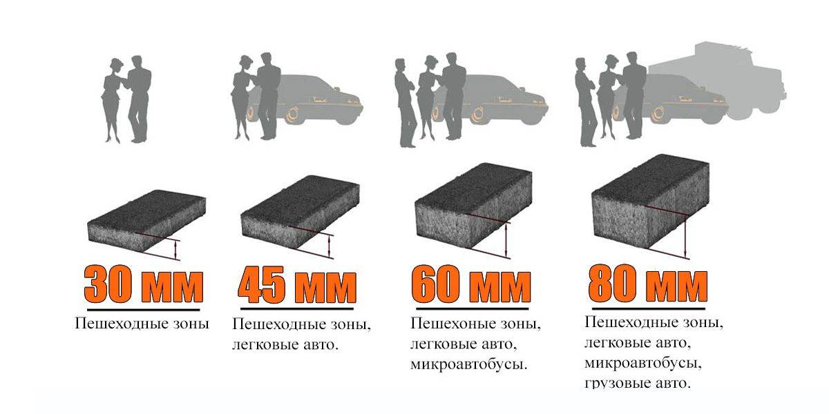Важно учесть толщину блоков. Минимальная – три сантиметра, для парковки и мест проезда автомобиля – не менее 5-6 сантиметров