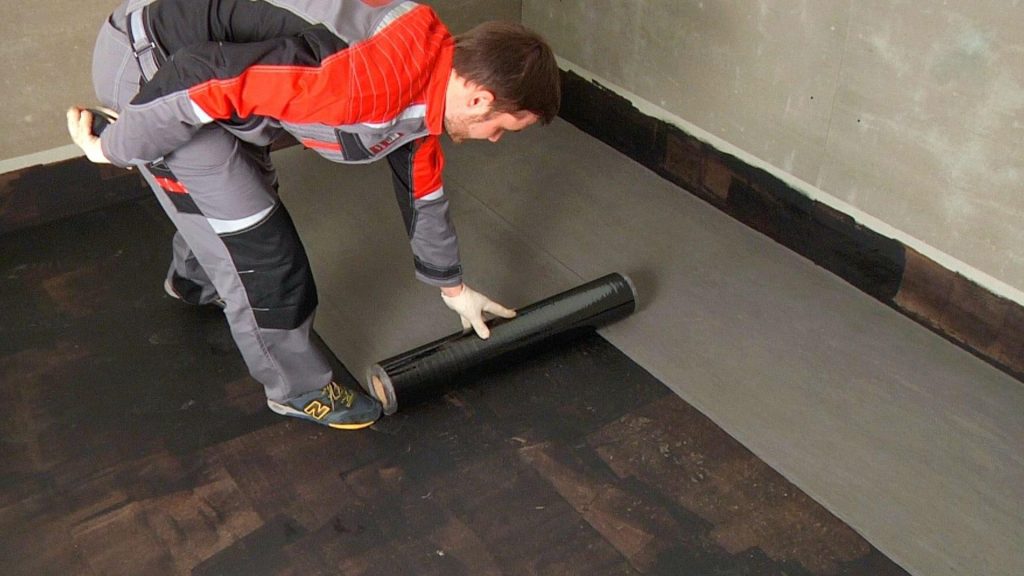 Обмазка битумной мастикой стяжки или лаг перед настилом деревянного пола.