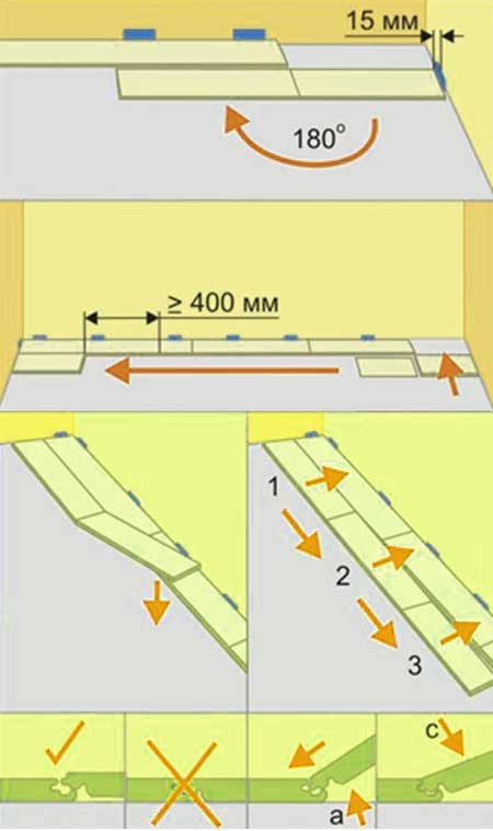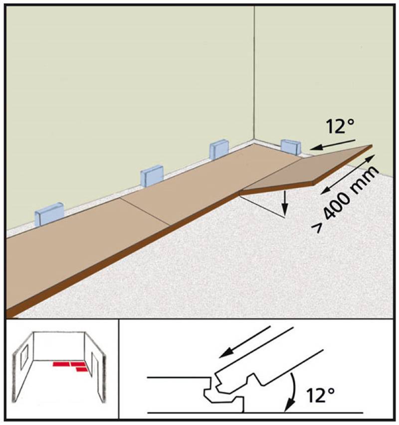 Первые панели укладываются шипом к ограждающим конструкциям, но этот элемент крепления необходимо срезать и установить деревянные клинья для регулирования компенсационного зазора. В случае диагональной укладки элементов первое изделие укладывают в угловой части комнаты. Его торцы обрезают под углом в 45 градусов и ориентируют эту часть детали на угол комнаты, также учитывают компенсационный шов. Свободный паз ламината находится на длинной стороне изделия (гипотенузе треугольника).