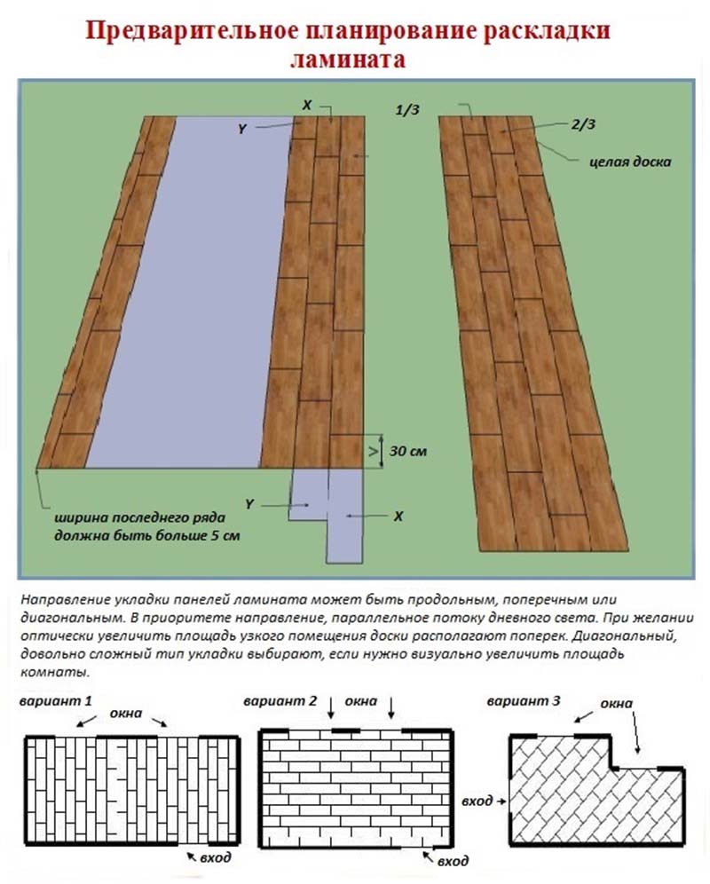 Многие пользователи не знают, как правильно уложить ламинат. Во время приближения к центральной части квартиры для заполнения рядов используется несколько планок. Их подрезают поочерёдно, то с узкой, то с широкой части помещения под углом в месте примыкания к ограждающим конструкциям.