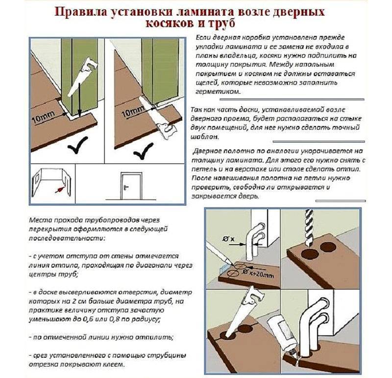 - Укладка отдельных элементов ведётся по направлению слева направо, начинать работу нужно от противоположного окна и заканчивать дверным проёмом. Дверное полотно навешивается на петли после окончания основных работ.