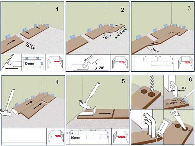 Если первая доска уложена в угловой части комнаты, то несколько рядов напольного покрытия необходимо зафиксировать к нес с широкой стороны комнаты, учитывая величину зазора. Затем соединяем элементы с узкой стороны помещения и заполняем угол. Панели с ламинированной фаской соединяются между собой при помощи специальных замков. Все детали подбивают резиновым молотком до полной фиксации. Вместо этого инструмента можно использовать обычный молоток, но для смягчения удара применяется деревянный брусок.