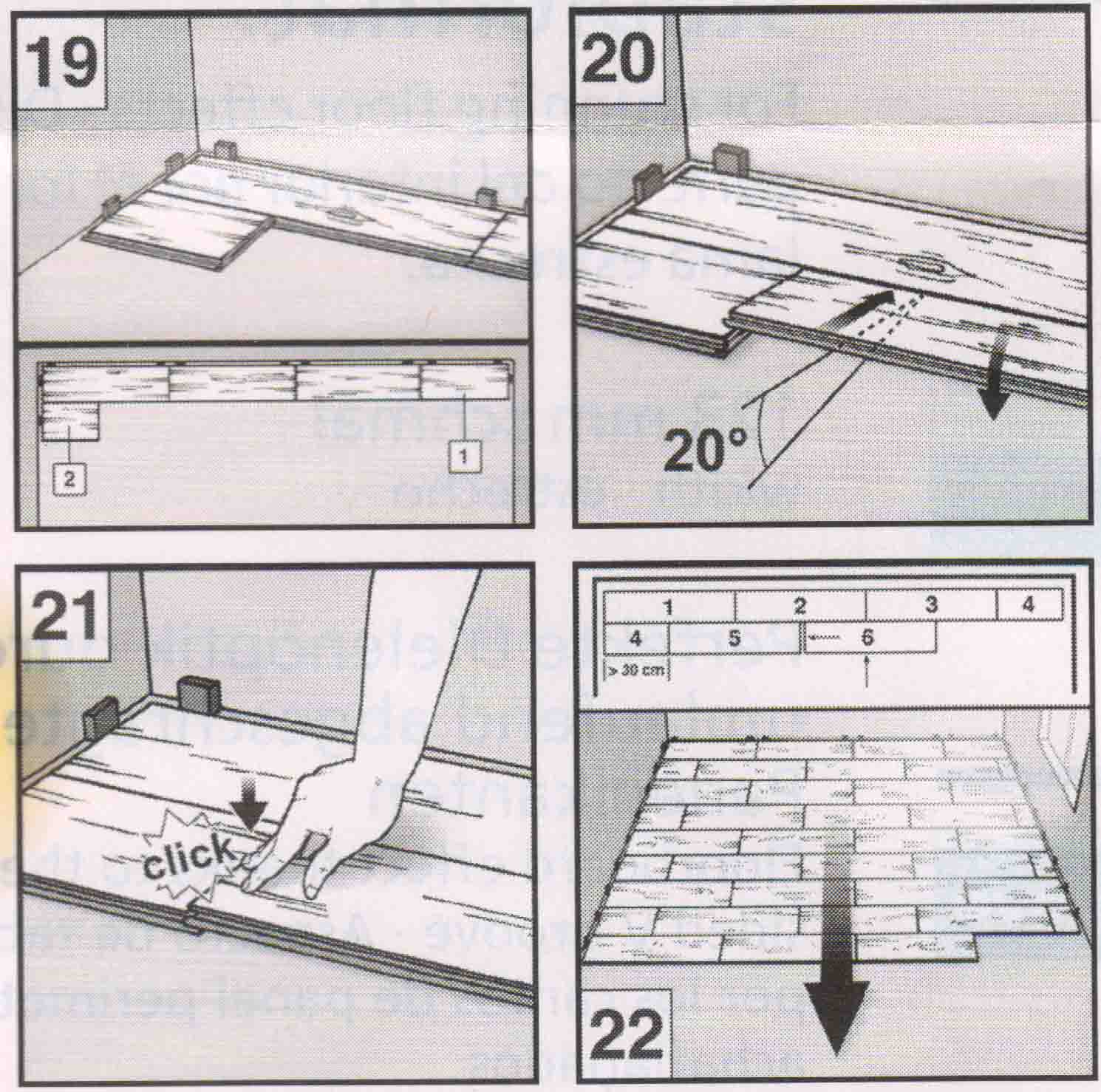 К ранее установленному первому ряду напольного покрытия поочерёдно подбиваются элементы второго ряда. Детали надёжно скрепляются между собой длинной и короткой стороной. После завершения монтажа каждого из рядов делают компенсационный зазор между напольным покрытием и ограждающими конструкциями при помощи клиньев. Для монтажа последнего ряда применяется струбцина.