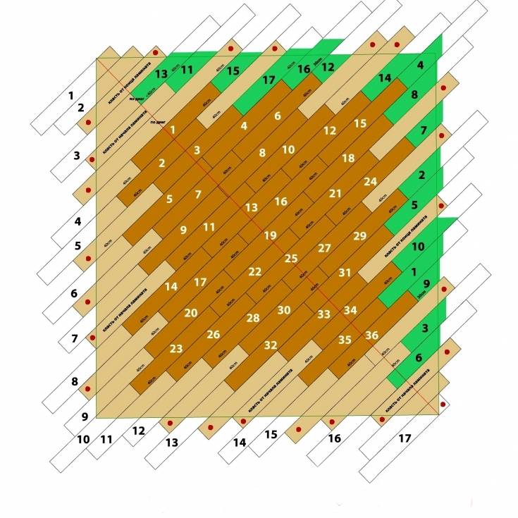 - При диагональном способе укладки начинают монтаж из одного из углов помещения.