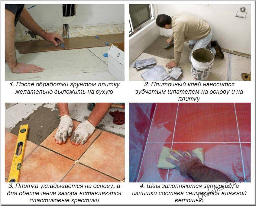 Спустя сутки после грунтования гипсоволокнистого основания переходят к выкладыванию плиточного покрытия.