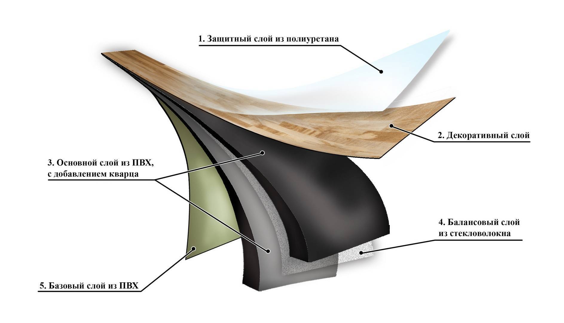 Первая категория имеет сложную структуру, состоящую из нескольких слоёв, самый важным из которых является первый ламинирующий. В зависимости от модификации покрытия он может иметь толщину от 0,2 до 0,5 мм – чем больше это значение, тем более долговечным будет материал. Второй слой определяет цветовую палитру и дизайн изделий.