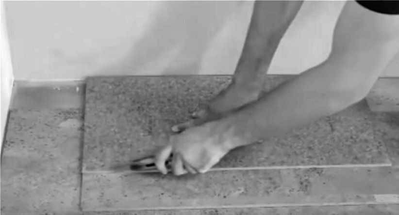 Дав адгезионной смеси немного подсохнуть, плитки плотно прикладывают к основанию и простукивают резиновой киянкой для улучшения прилегания. Поверхность плитки по краям протирается влажной губкой для удаления выступившего наружу клея. Каждый последующий ряд наклеивается со смещением относительно предыдущего, то есть в шахматном порядке. Последними наклеиваются подрезанные плитки.