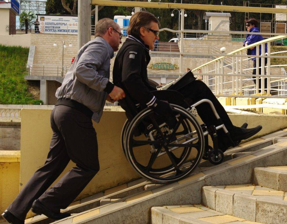 Уклон въезда по направляющим, установленным на стандартный лестничный марш, конечно, не соответствует нормативным требованиям. Но, в присутствии сопровождающего, наличие складного пандуса для инвалидов на лестничный марш намного облегчает процесс подъема в коляске.