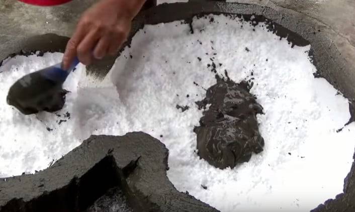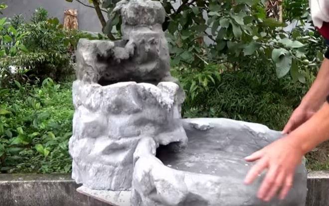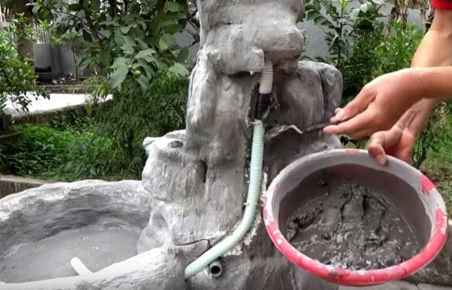 Для создания формы и технических отверстий нужно постоянно сверятся с фото процесса. После того как фонтан будет возведен, нужно вставить пластиковую трубку и продеть шланг, как на фото.