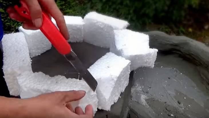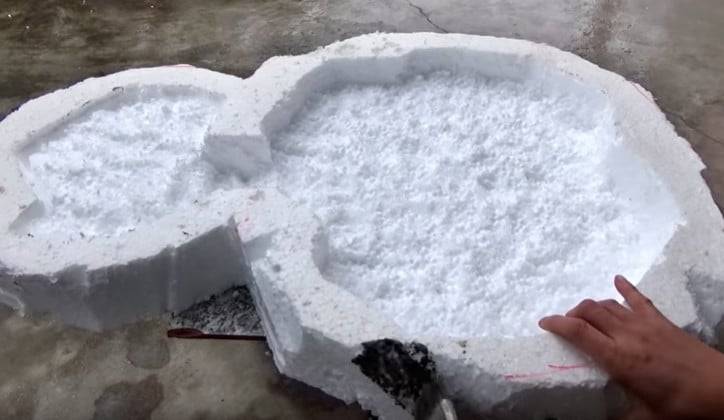 Затем сделать бортики из кусков пенопласта, укладывая их произвольно. Сначала куски пенопласта можно крепить друг к другу деревянными шпажками, затем промазывать раствором цемента.