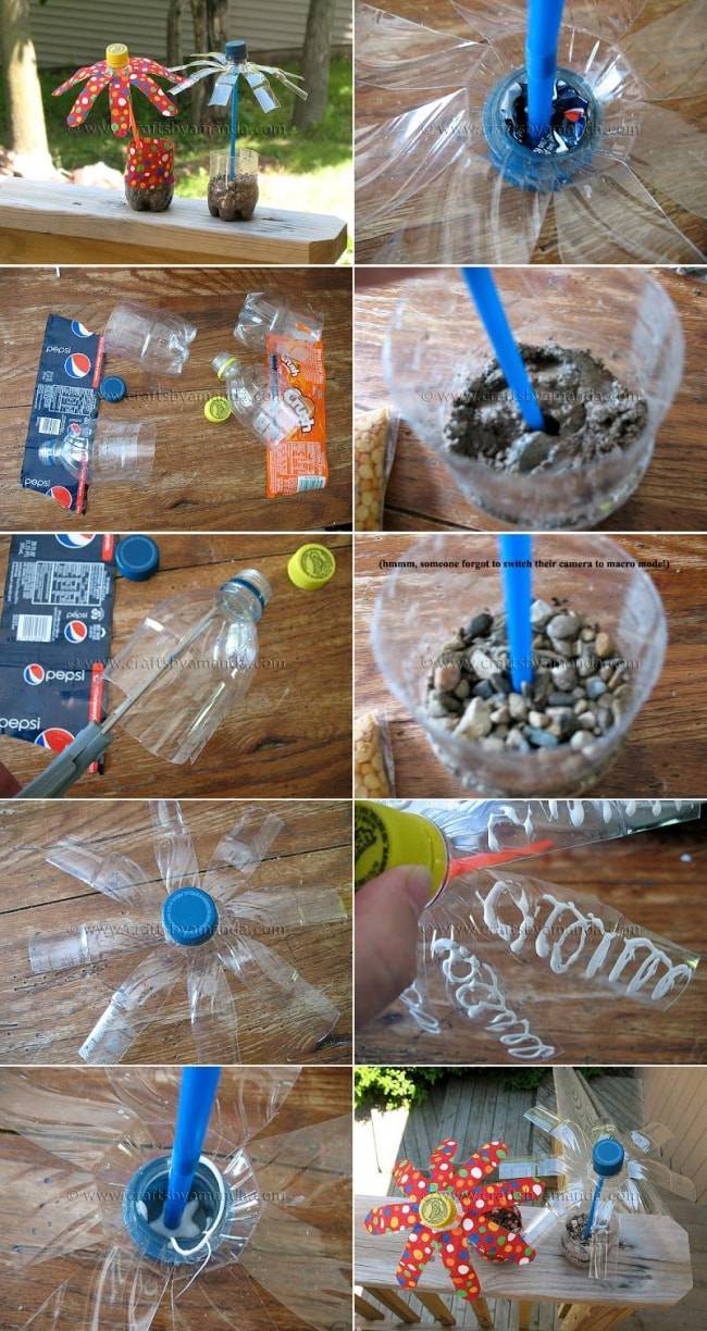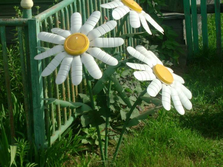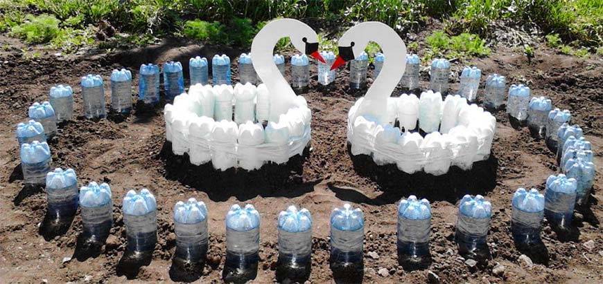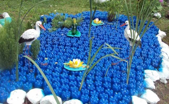 На заметку: пластиковые поделки разместите в глубине клумб или сада, особенные если во дворе играют маленькие дети. Так, они не смогут дотянуться руками до искусственного декора, ведь края пластиковых изделий могут легко поранить.