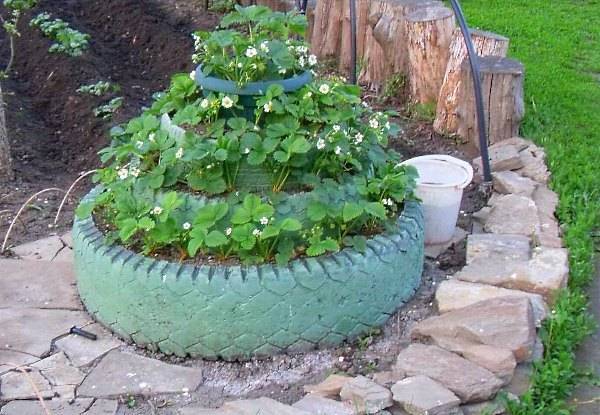 Одним из самых распространенных материалов для садового декора являются автомобильные шины. Из прочной и гибкой резины можно создать очаровательные вазоны, фигурки разных животных, песочницу, детские качели и пр.