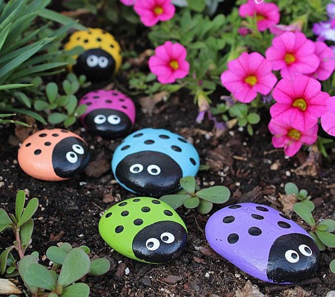 Интересные композиции получаются из расписных камушков. Если несколько, примерно одинаковой формы и размера, камней расписать «под кактус» — зеленый фон и светлые черточки, имитирующие колючки — разместить их в цветочных горшках и красиво расставить на заранее подготовленной площадке, получится почти настоящая оранжерея.