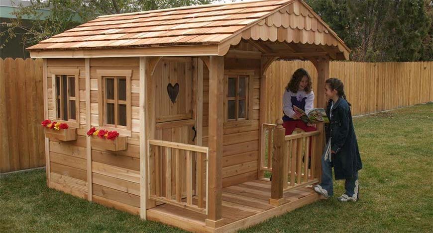Еще одна креативная дачная идея — деревяный домик. Если ребята получат в свое распоряжение небольшой домик, особенно обставленный мебелью, восторгам не будет конца. Они и сами пофантазируют над его украшением.